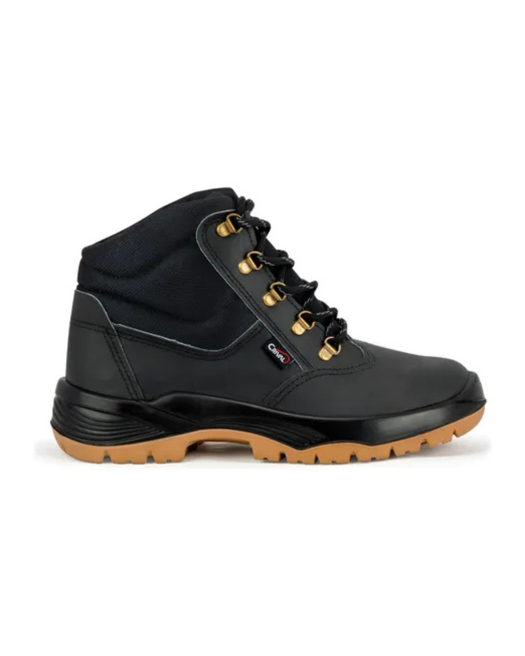 Botina de segurança com fechamento em cadarço recoberto confeccionado em couro liso na cor preta, colarinho com forração interna, forro do cano em nylon com tratamento antimicrobiano.