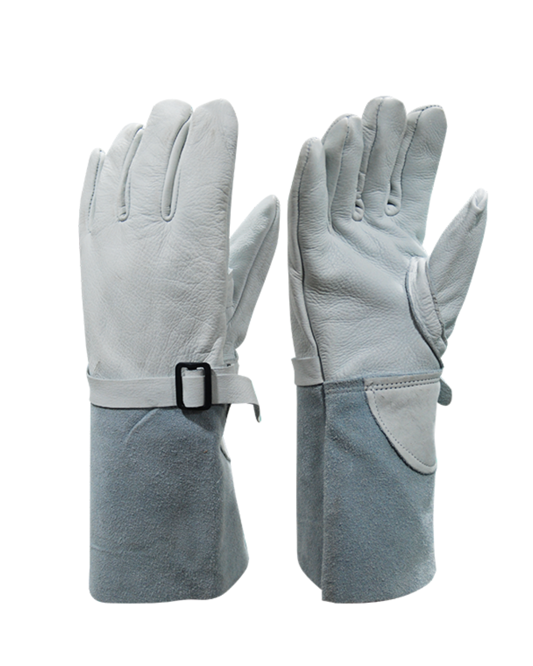 Mão confeccionada em vaqueta, punho de raspa, tira de reforço em vaqueta entre o polegar e indicador, protetor de artéria em vaqueta, tira na altura do punho e fivela plástica para ajuste.