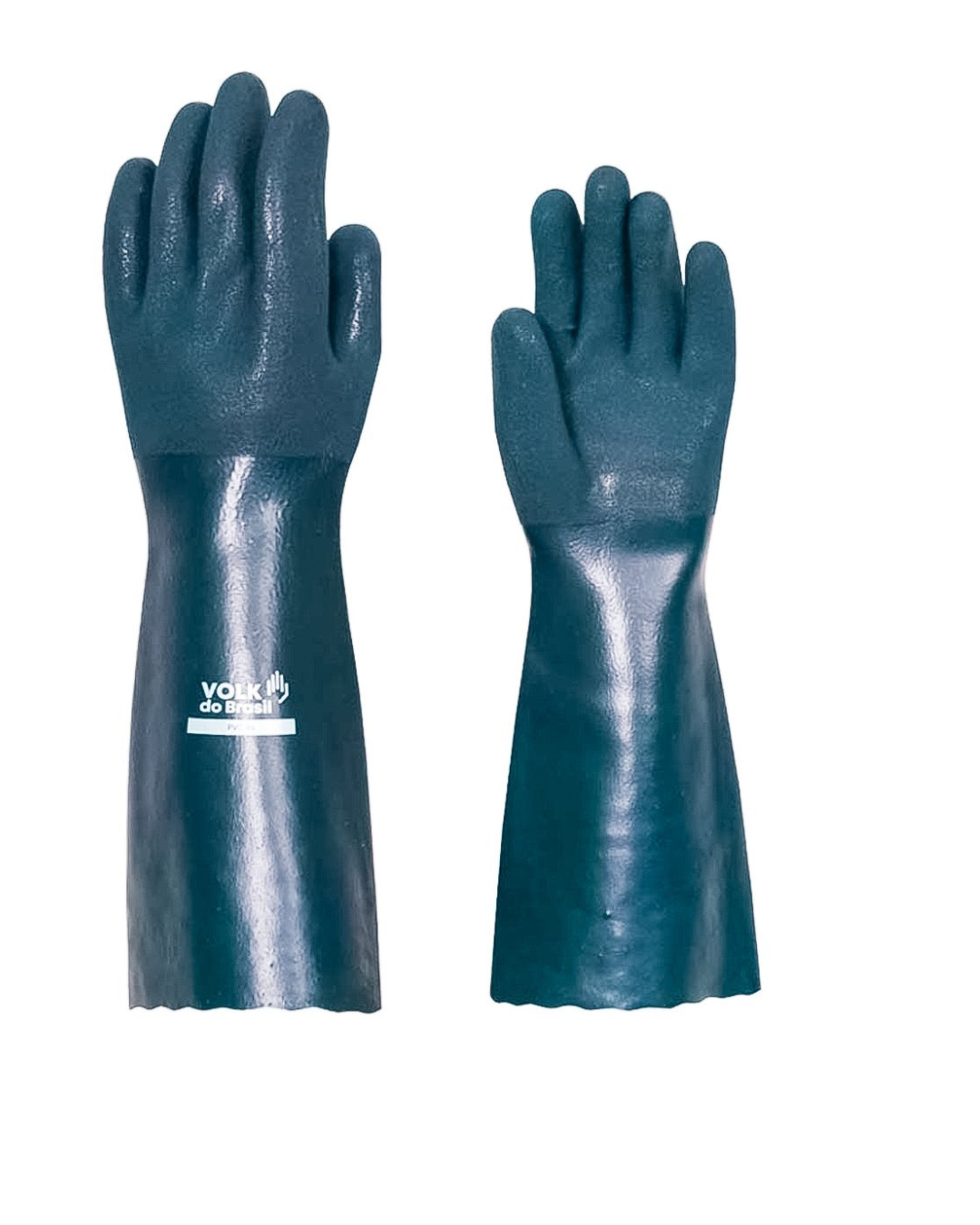 Luva de segurança confeccionada em suporte téxtil de algodão, revestimento externo de PVC com acabamento áspero antiderrapante na face palmar, extremidade dos dedos e dorso, extremidade do punho com acabamento serrilhado.