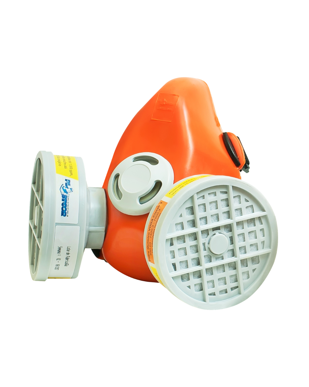 Máscara com 2 filtros confeccionado em termoplástico atóxico, dois conectores para fixação dos elementos filtrantes, duas válvulas de inalação e uma válvula de exalação e quatro alças para fixação das presilhas plásticas com regulagem e dois tirantes elásticos para fixação do respirador na cabeça.