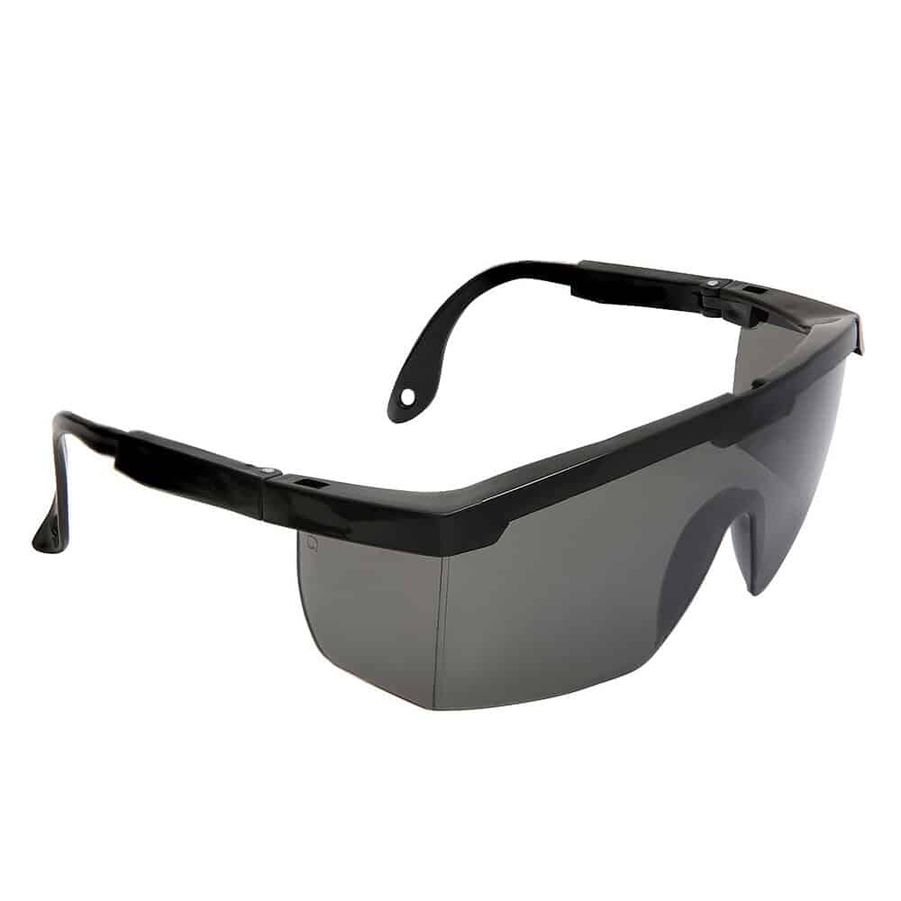 Óculos de segurança confeccionado em policarbonato óptico, com armação de nylon e hastes com comprimento regulável. Filtra 99,9% dos raios UVA e UVB