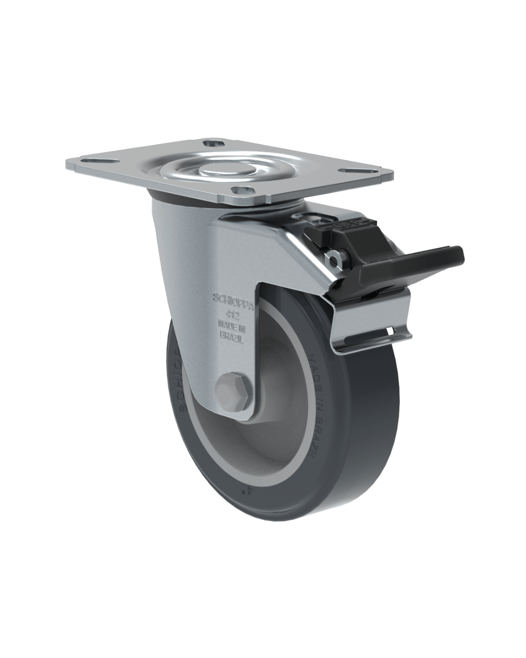 Rodízio giratório com base em chapa de aço zincado,Indicada para pisos em bom estado de conservação. Disponível com e sem freio.